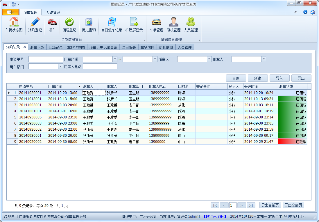 軟件最大程度的簡化車輛派車流程的管理,綜合了車輛預約、派車及打印派車單、回場登記等功能,在界面上盡可能關聯相關的基礎數據,如車輛信息,人員信息,車輛信息,實現數據的快速錄入,減輕派車值班人員的工作量,另外系統提供了車輛歷史記錄報表功能,方便統計指定時間內的車輛里程。